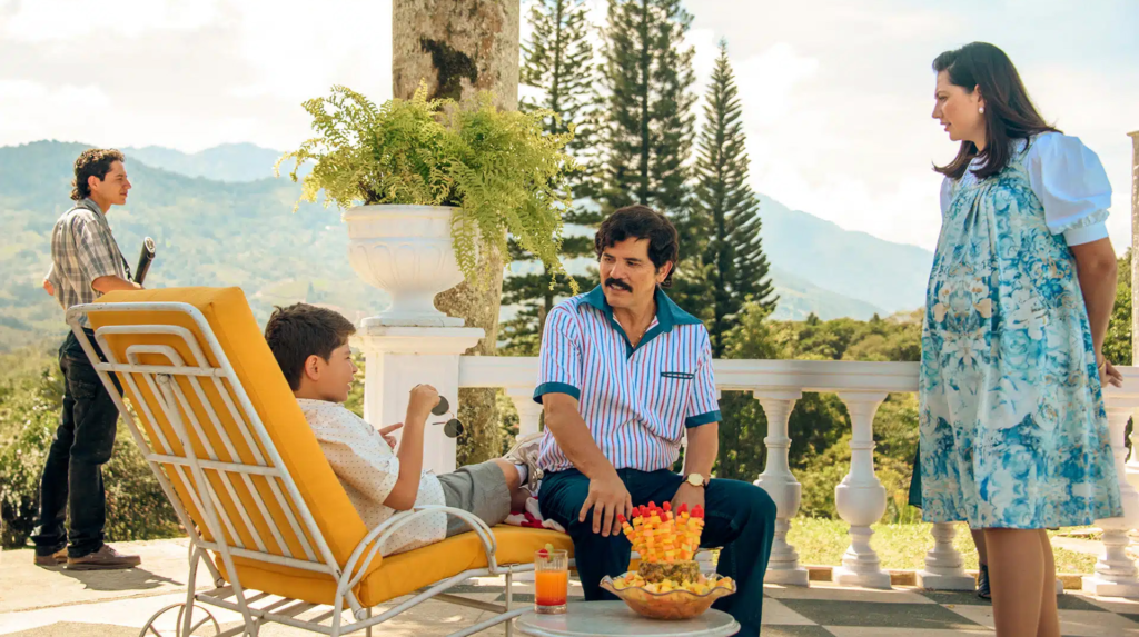 Outro ponto fascinante e raramente explorado com tanta sensibilidade no catálogo do Disney+ é a maneira como a série trabalha o fator humano por trás da mitologia do crime. Não se trata apenas de contar mais uma história ligada ao cartel de Medellín, mas de explorar sentimentos universais e contraditórios que coexistem em estado bruto na psique de uma criança: a solidão de ser filho único em meio a um batalhão de adultos, a confusão entre o amor genuíno pelo pai e o medo da fera que ele representa para os outros, e a admiração infantil por aqueles “tios” fortões que o carregam nos ombros, que aos poucos vai se transformando na percepção de que aqueles braços também carregam fuzis e segredos de morte. A produção humaniza o monstro sem jamais justificá-lo, e é nesse delicado equilíbrio que reside sua maior força. Há, naturalmente, momentos em que a minissérie poderia se aprofundar mais na relação psicológica entre Juan Pablo e essas figuras ambíguas que o cercam; felizmente, essa pequena economia narrativa não chega a comprometer o impacto geral de uma obra que se destaca pela contenção.