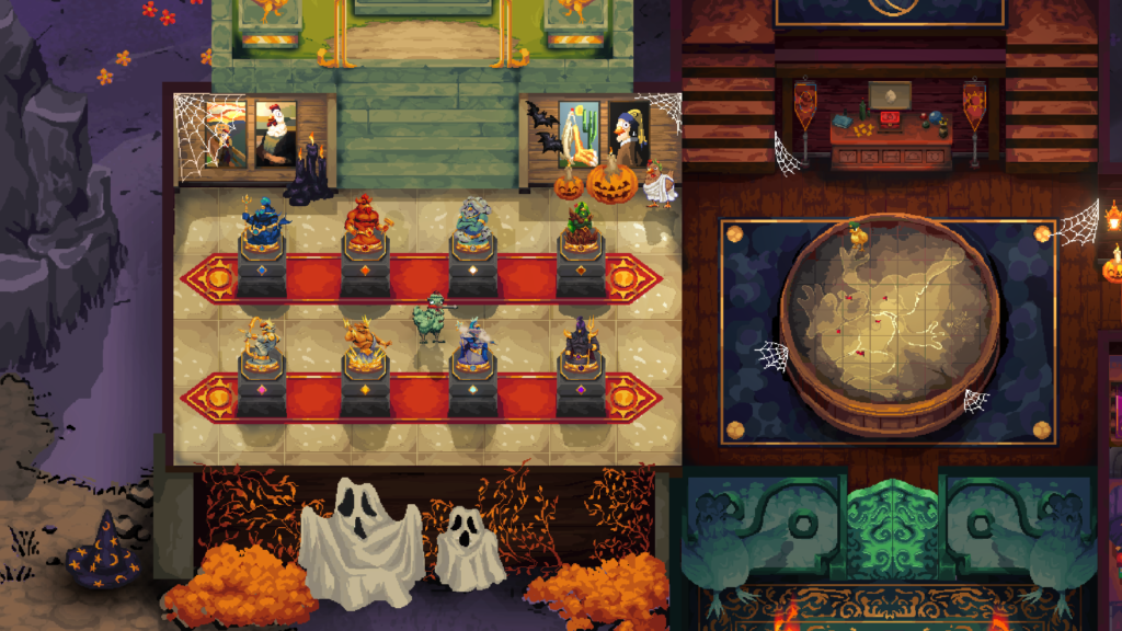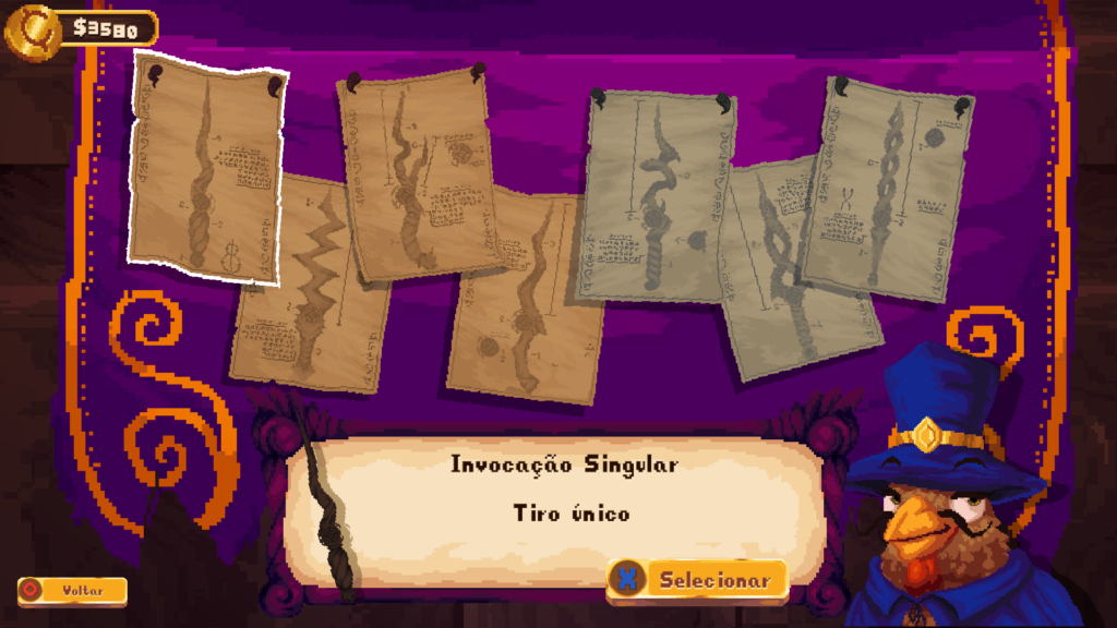 Além das fases do jogo, os campos de batalha, temos também, o hub, que é a base das galinhas mágicas. É onde a gente tem acesso ao lugar que criamos nossas varinhas, um observatório que mostra nossa árvore de talentos, a granja onde podemos escolher nossa galinha, além de uma galeria com colecionáveis que podem ser equipados e um altar com nossas conquistas. Tudo isso vai progredindo de acordo com o que vamos jogando, liberando mais possibilidades na gameplay.